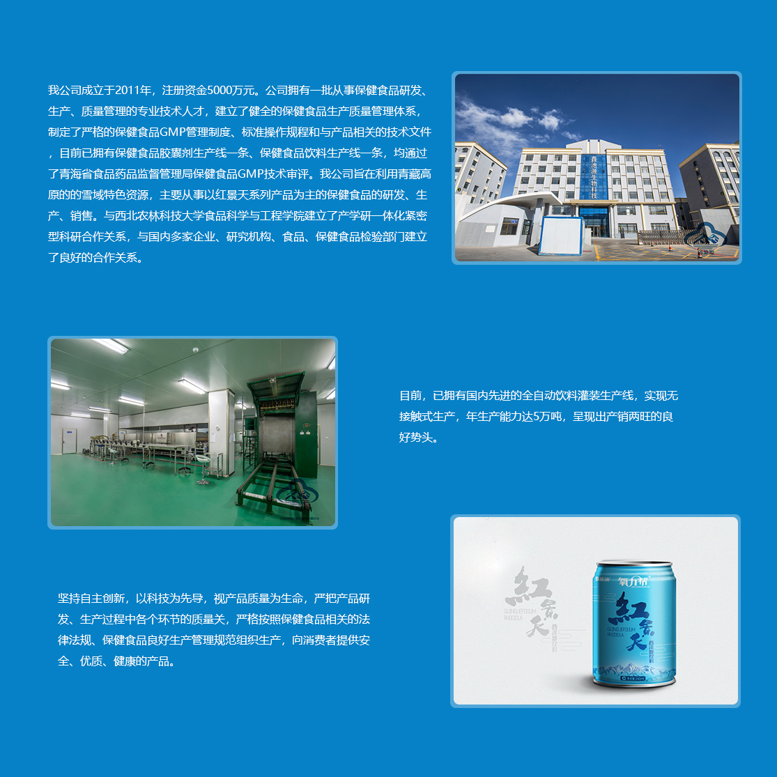 鑫池源公司立足于青海省綠色環(huán)保無污染的高品質紅景天資源,以西北農林科技大學食品科學與工程學院和青海格拉丹東藥業有限公司為技術依托,主要從事紅景天、紅枸杞、黑枸杞等高原生態(tài)植物資源的研究開發(fā)和深加工,產品包括“景胨”牌紅景天西洋參保健飲品、紅景天口服液、紅景天膠囊等系列產品。